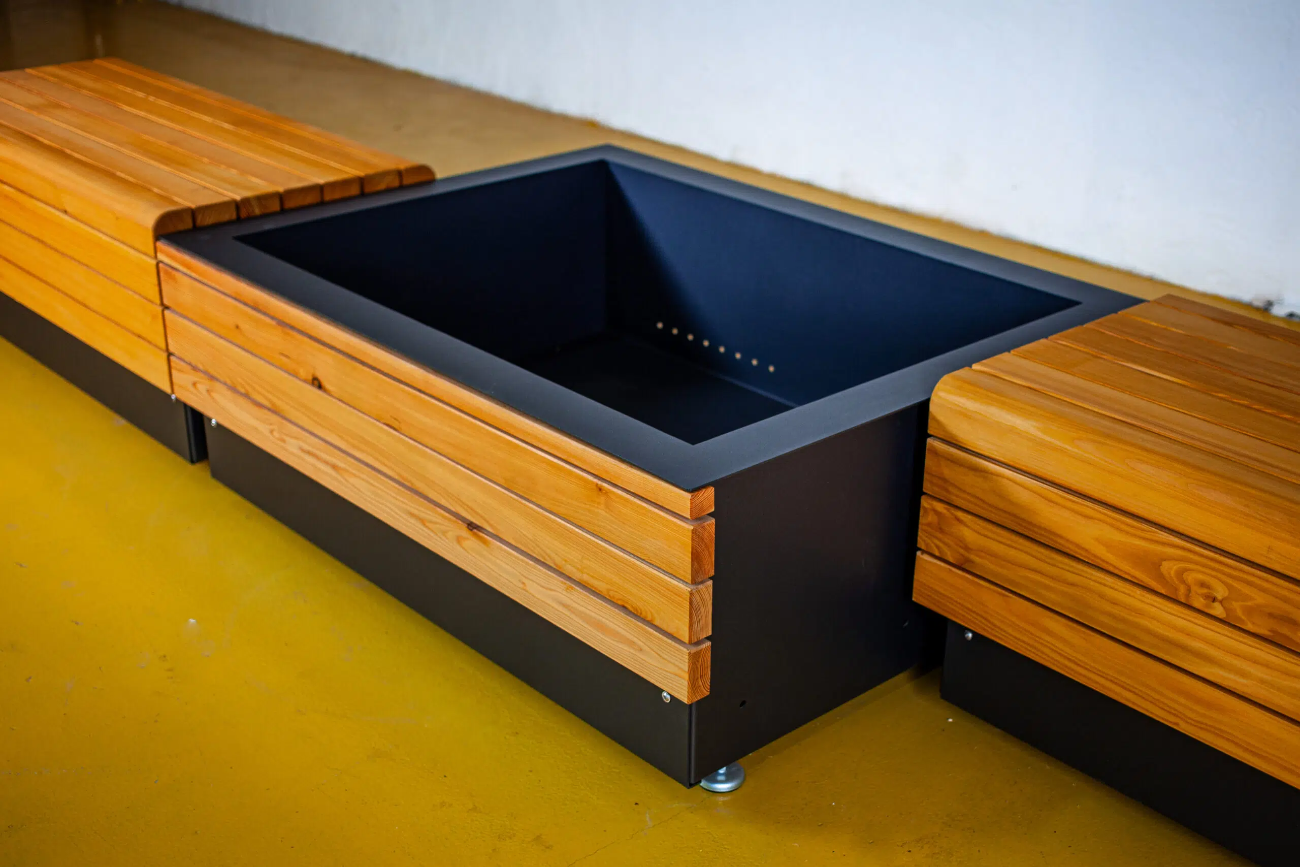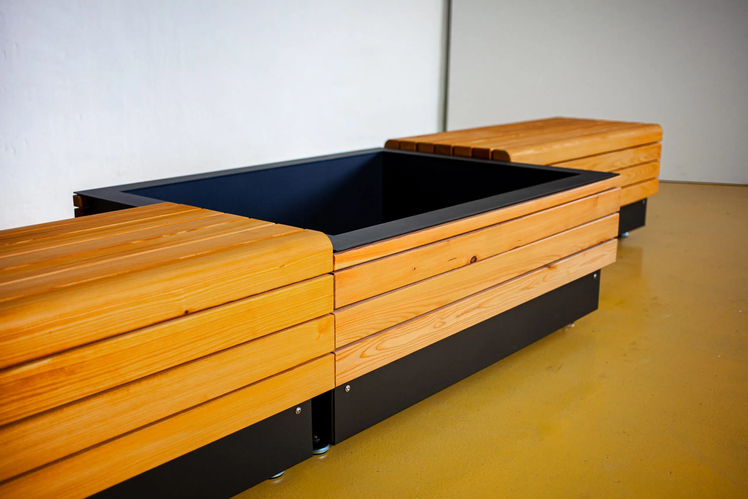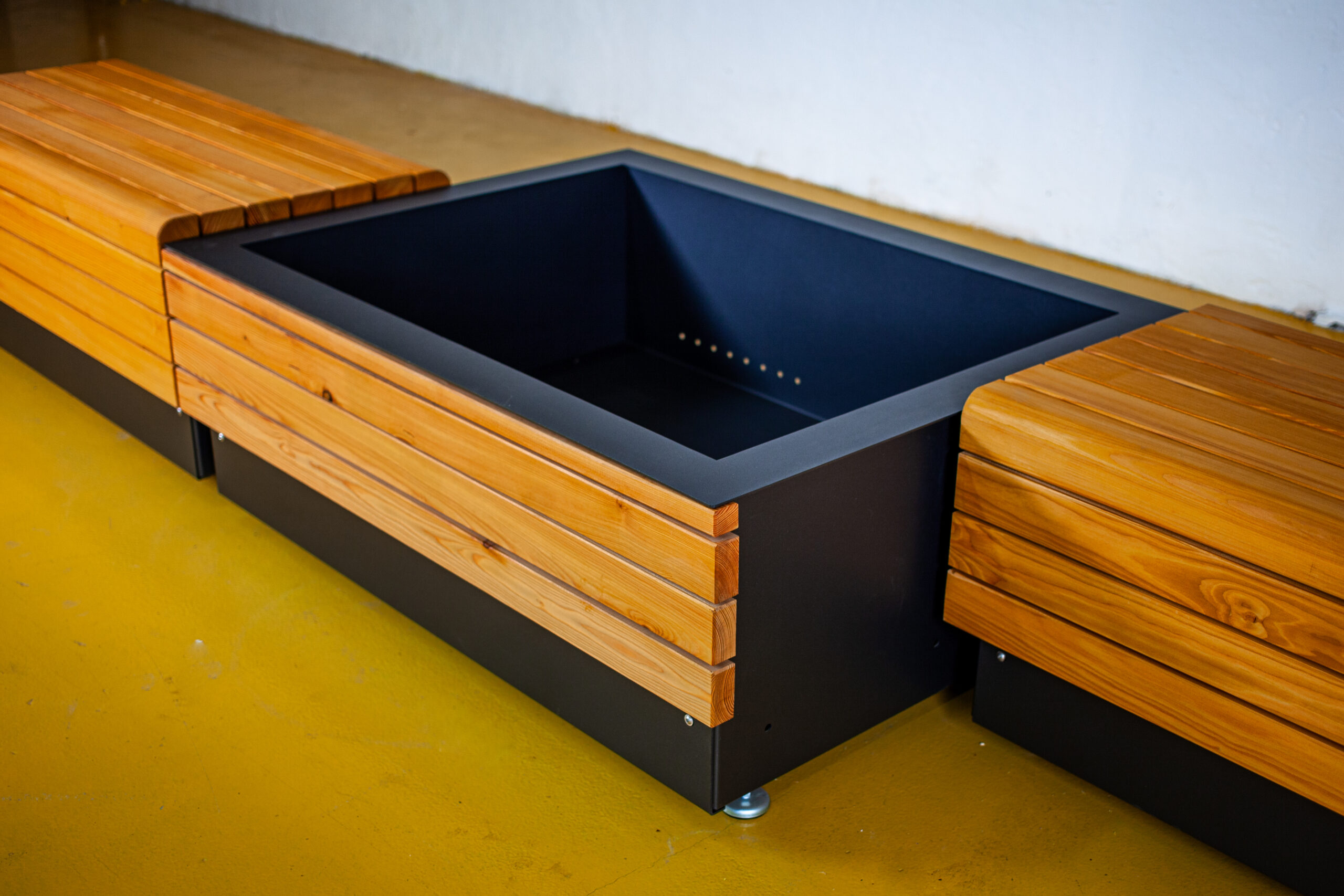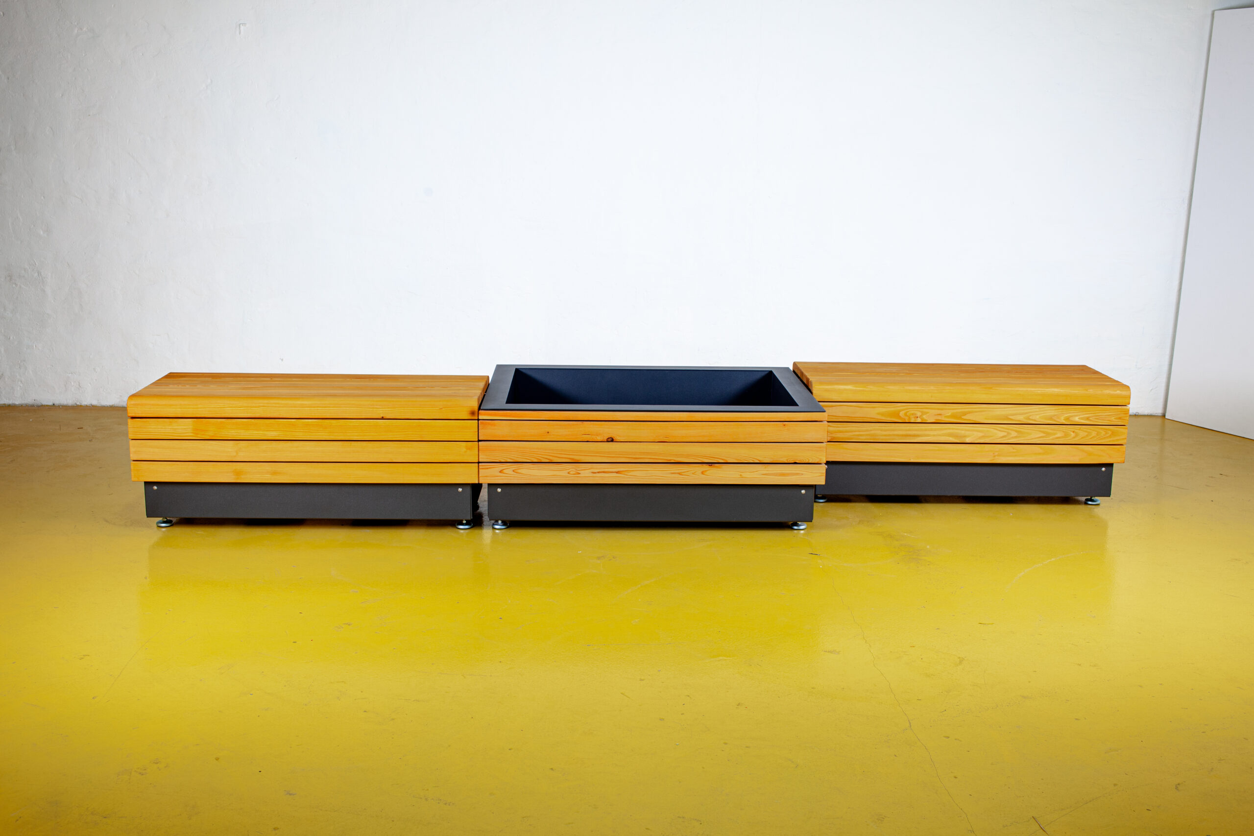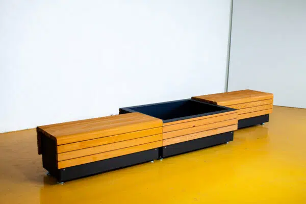 Module aus verzinktem Stahlblech 3mm, pulverbeschichtet, Holzprofile in heimischer Lärche aus nachhaltiger Forstwirtschaft, geölt. Verdeckung Hubwagenaufnahme durch Blende. Pflanzbehälter mit Entwässerung 5cm oberhalb des Bodens. Höhenverstellbare Füße.