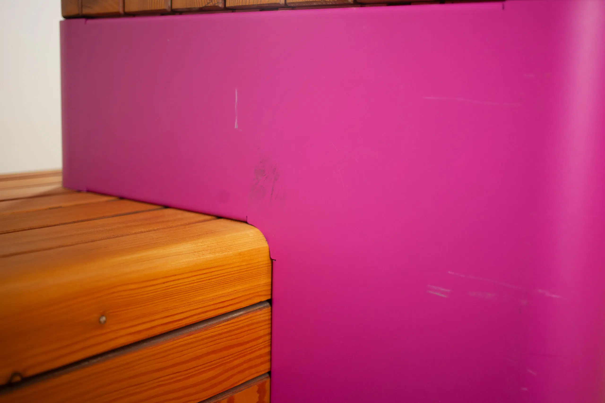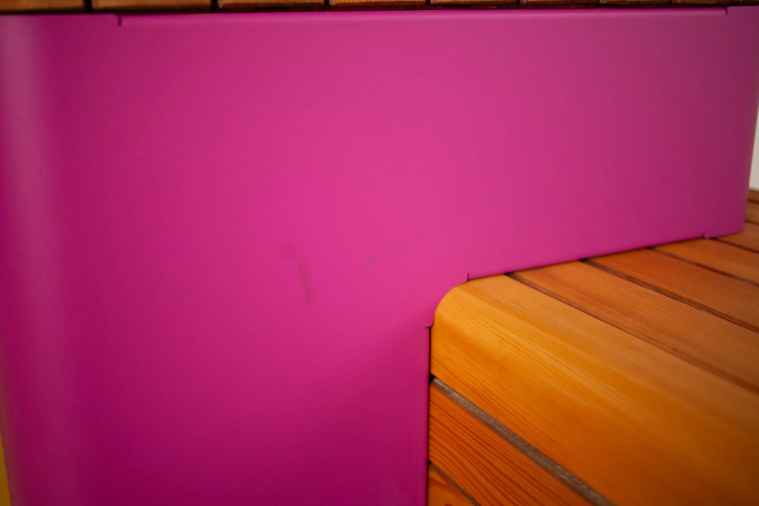 Module aus verzinktem Stahlblech 3mm, pulverbeschichtet, Holzprofile in heimischer Lärche aus nachhaltiger Forstwirtschaft, geölt. Verdeckung Hubwagenaufnahme durch Blende. Pflanzbehälter mit Entwässerung 5cm oberhalb des Bodens. Höhenverstellbare Füße.