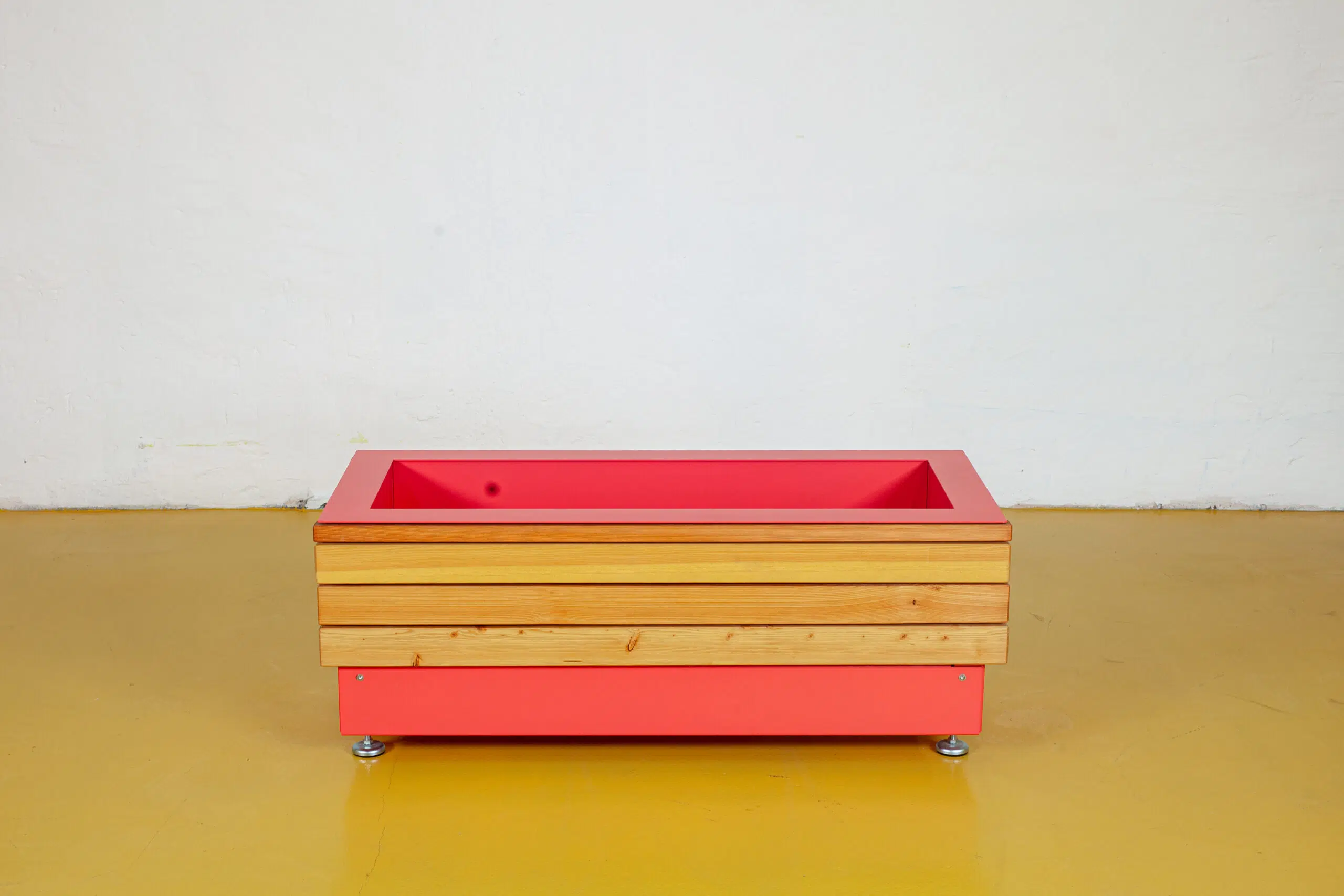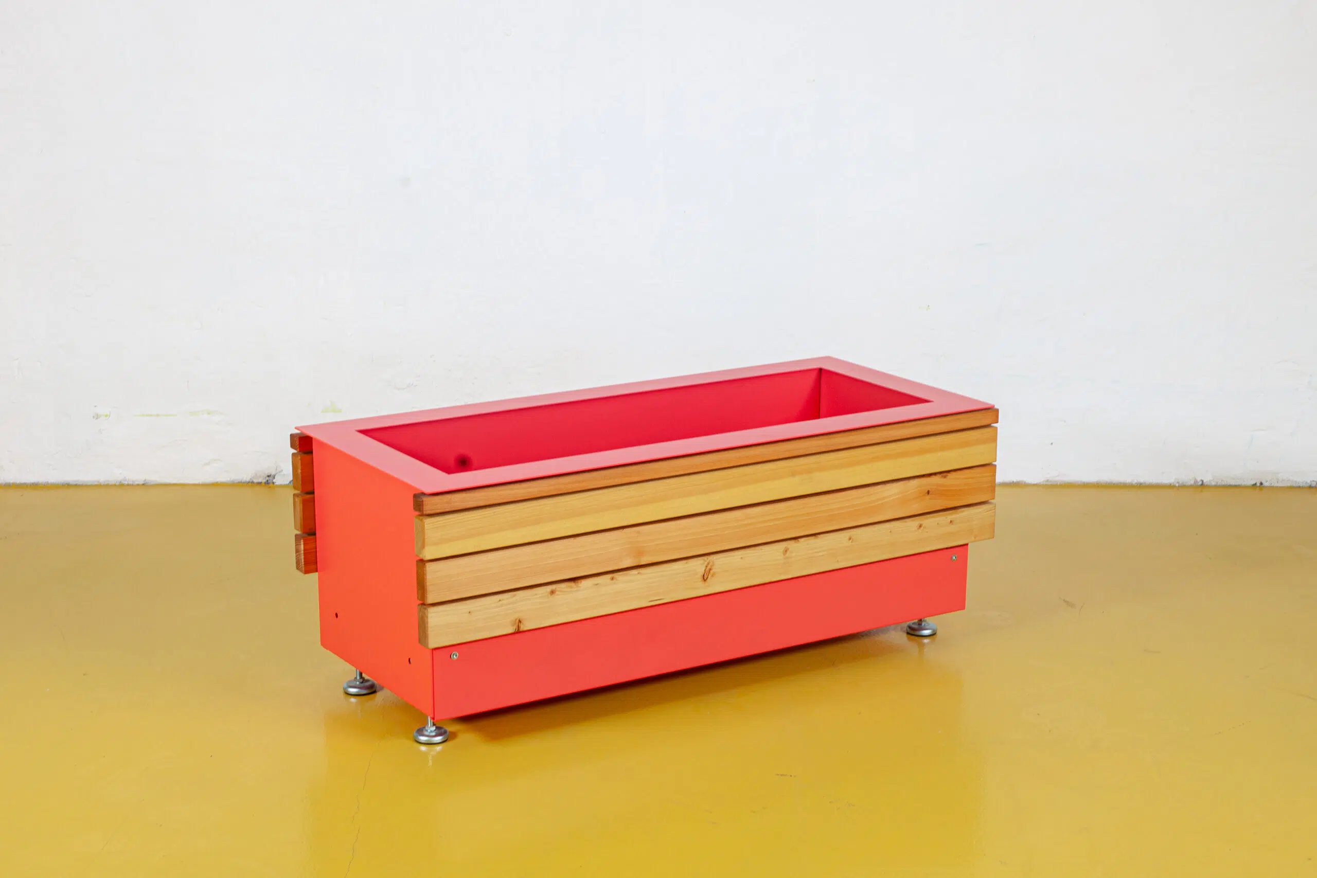 Pflanzkasten aus verzinktem Stahlblech 3mm, pulverbeschichtet, Holzprofile in heimischer Lärche aus nachhaltiger Forstwirtschaft (FSC-zertifiziert), geölt. Verdeckung Hubwagenaufnahme durch Blende. Pflanzbehälter mit Entwässerung 5cm oberhalb des Bodens. Höhenverstellbare Füße.