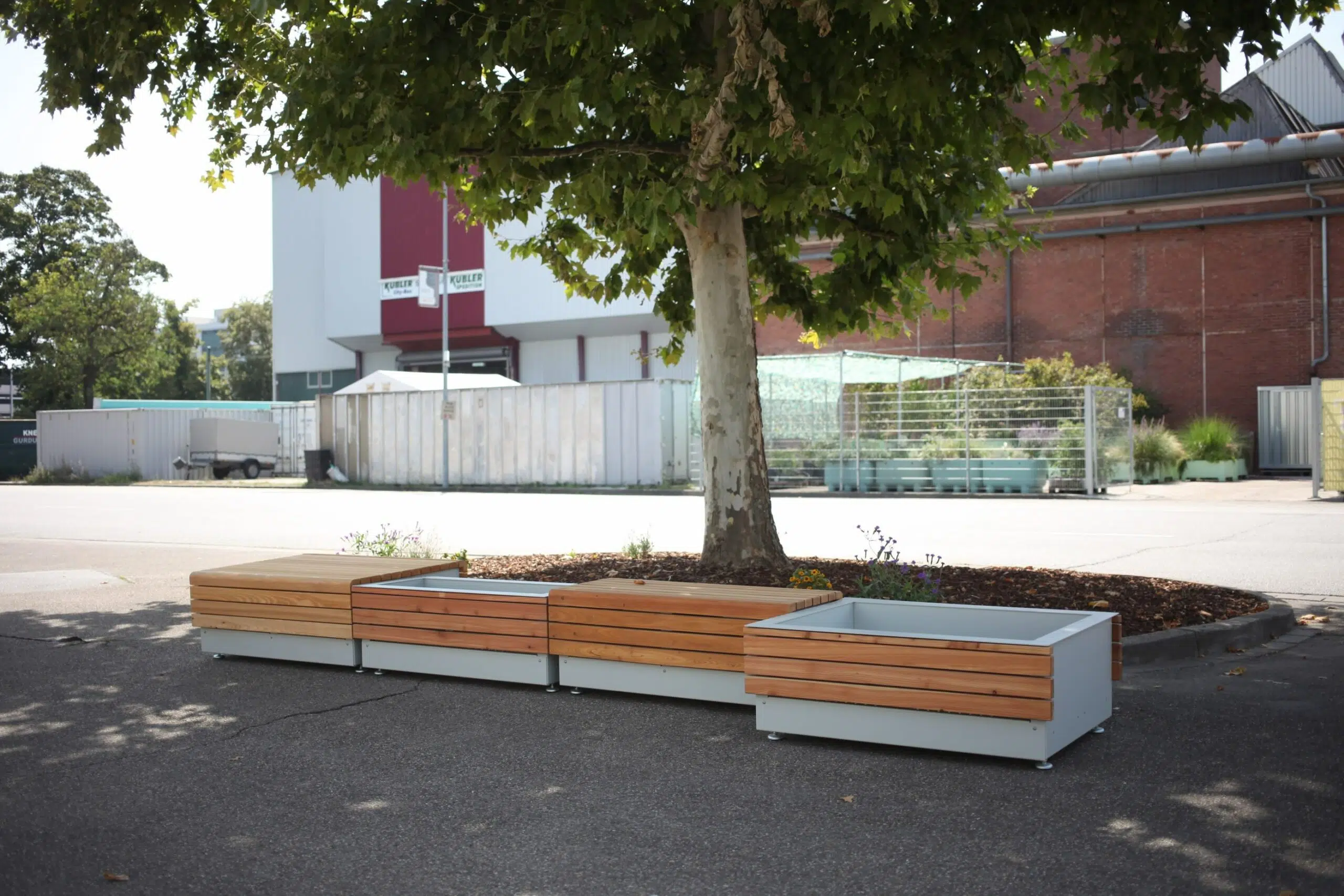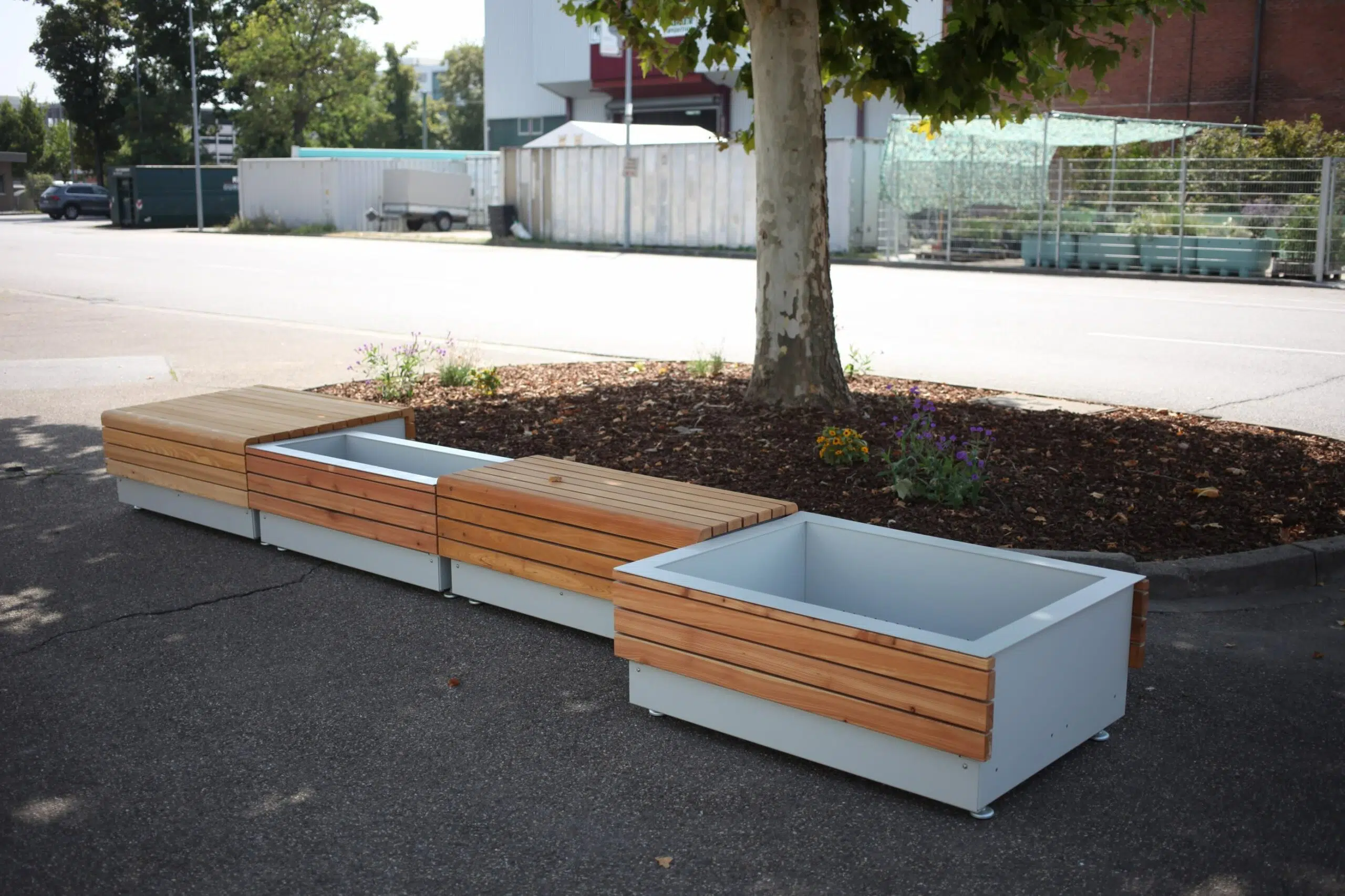 Module aus verzinktem Stahlblech 3mm, pulverbeschichtet, Holzprofile in heimischer Lärche aus nachhaltiger Forstwirtschaft (FSC-zertifiziert), geölt. Verdeckung Hubwagenaufnahme durch Blende. Pflanzbehälter mit Entwässerung 5cm oberhalb des Bodens. Höhenverstellbare Füße.